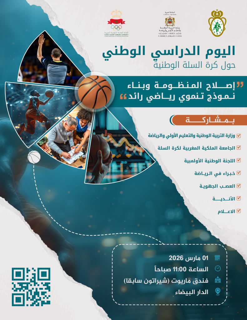 تنظم الجامعة الملكية المغربية لكرة السلة اليوم الدراسي الوطني حول كرة السلة الوطنية، تحت عنوان: « إصلاح المنظومة وبناء نموذج تنموي رياضي رائد »، وذلك يوم الأحد 1 مارس 2026 بفندق ماريوت (شيراتون سابقًا) بمدينة الدار البيضاء، ابتداءً من الساعة الحادية عشرة صباحًا.