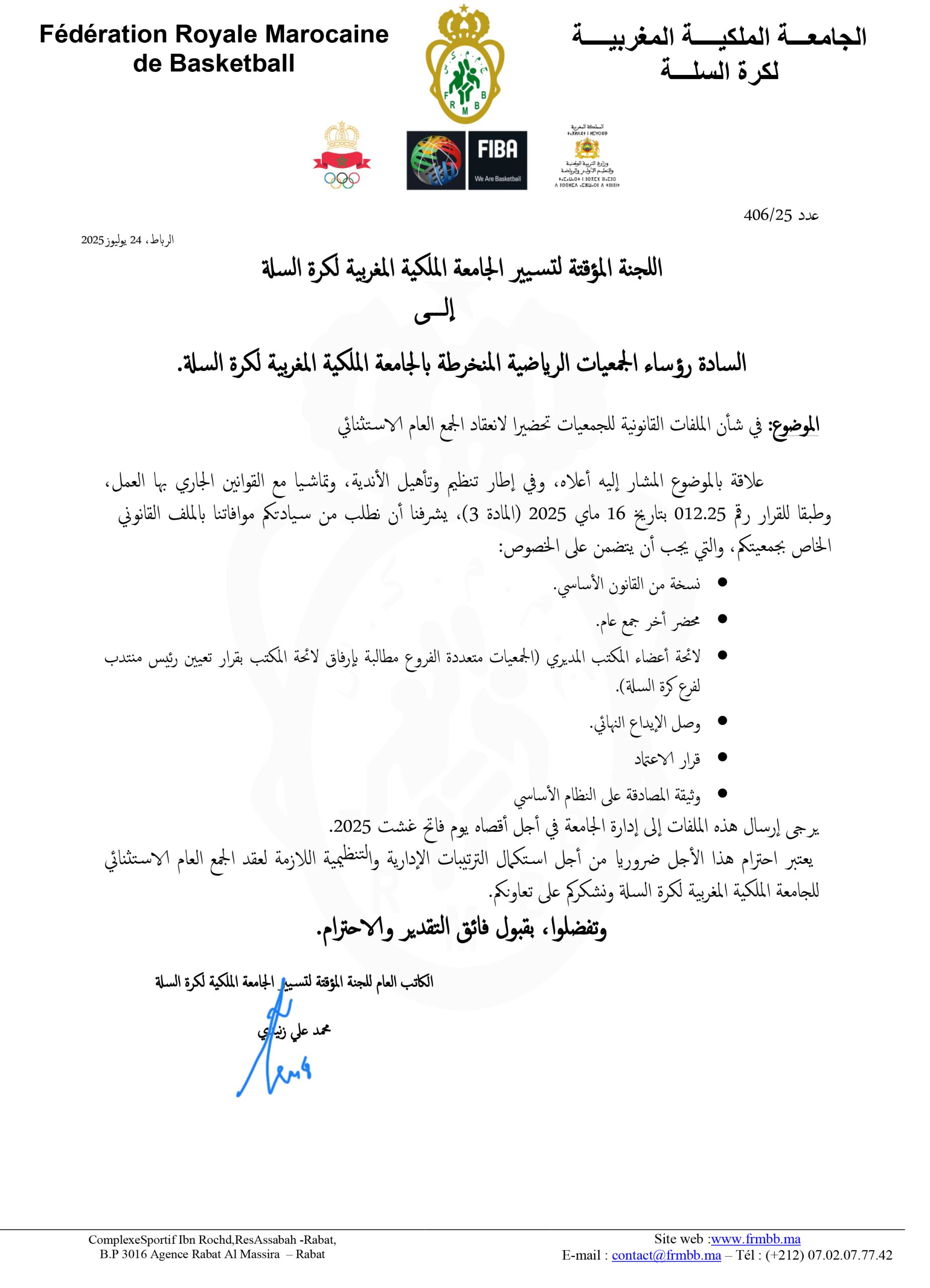 بلاغ صادر من الجامعة الملكية المغربية لكرة السلة