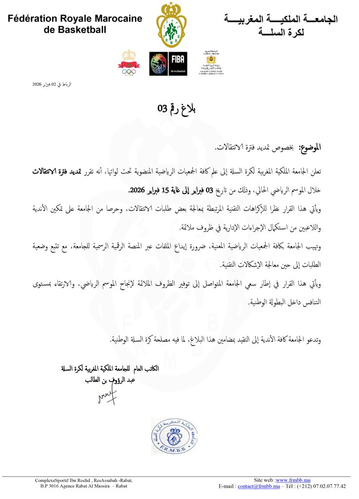 بلاغ بشأن تمديد فترة الانتقالات للموسم الرياضي 2025-2026