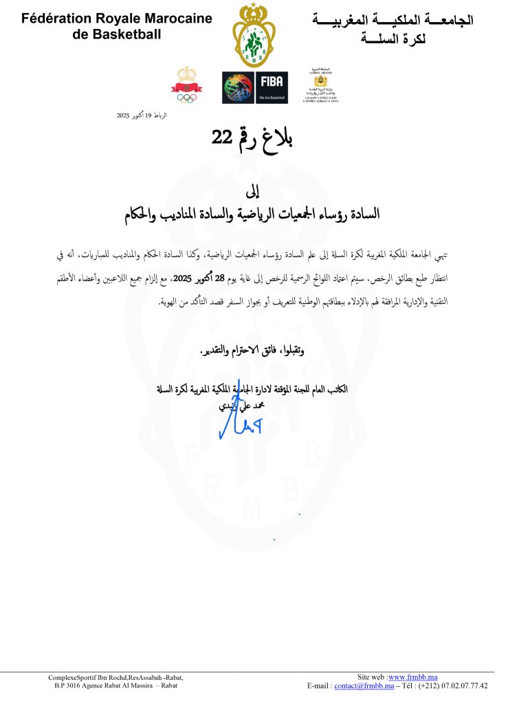 تنهي الجامعة الملكية المغربية لكرة السلة إلى علم كافة أندية القسم الوطني الأول (ذكور)...